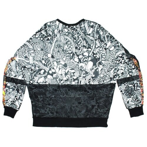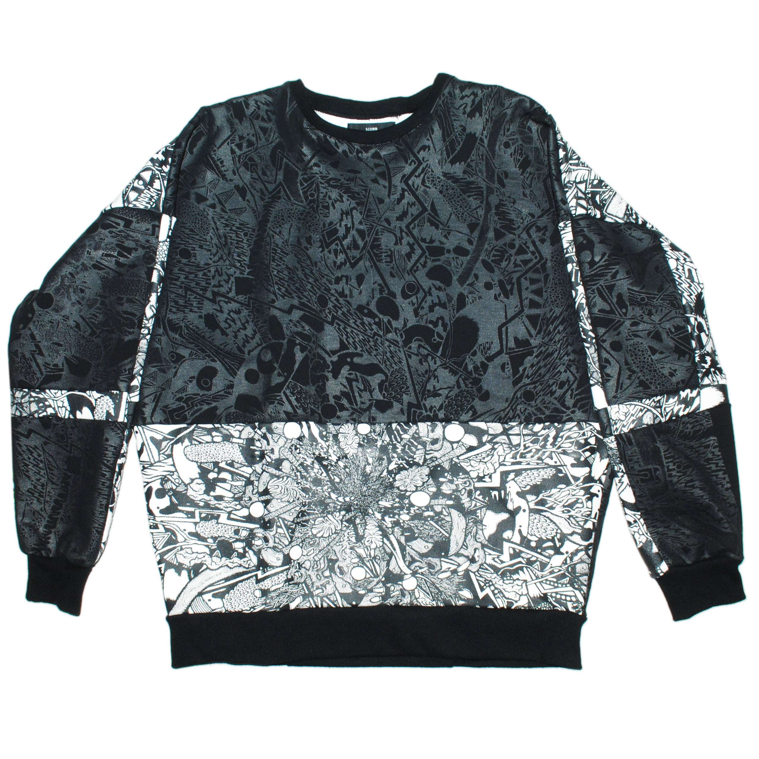 展示作品でもある大判点描画を原寸大でシルクスクリーンを製版しプリント、縫製を全て自身で行った一点モノのスウェットシャツ。
