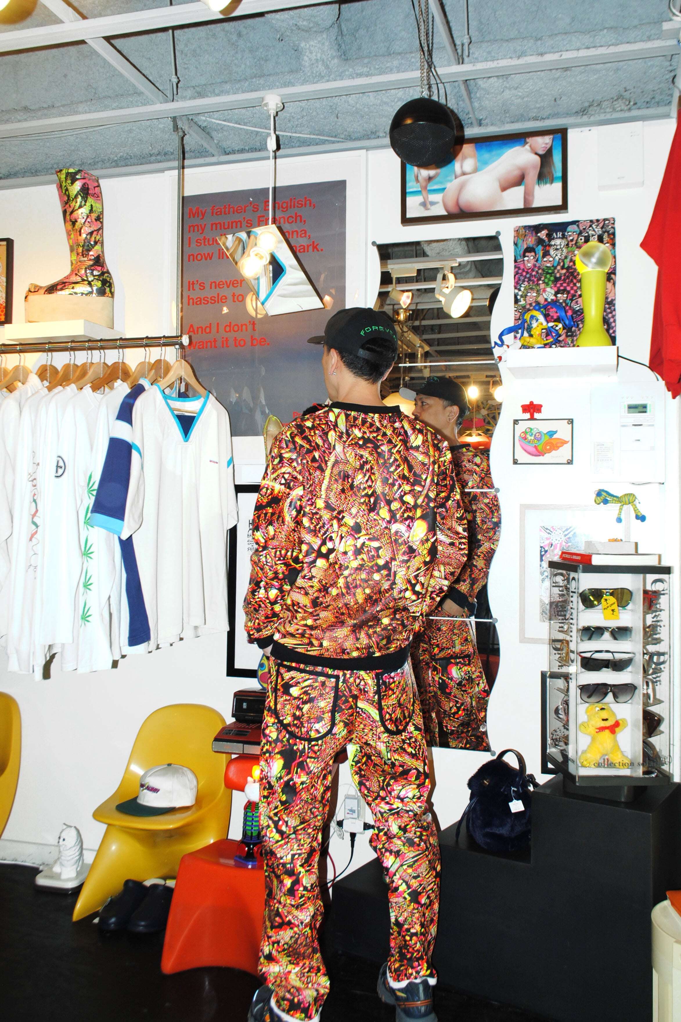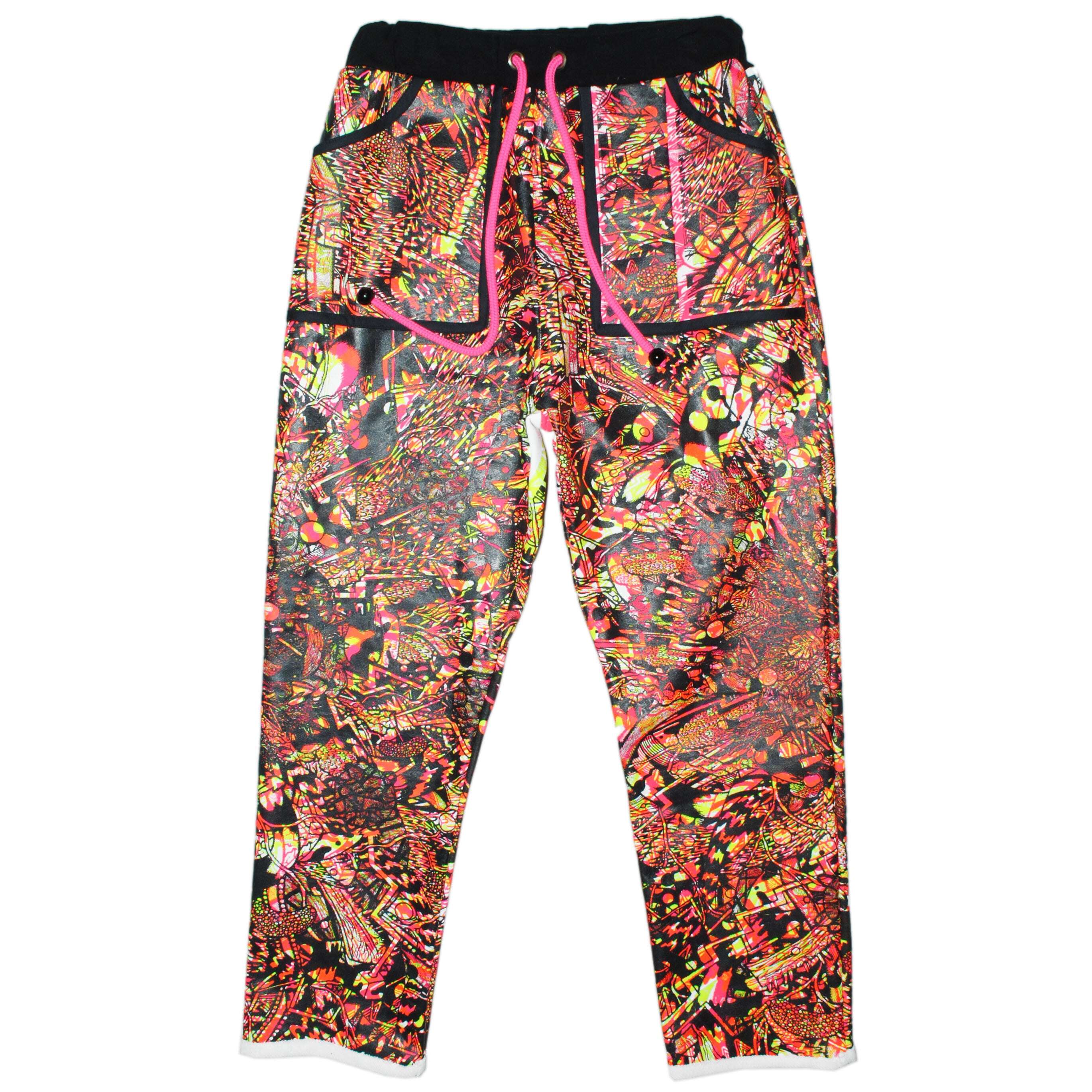 展示作品でもある大判点描画を原寸大でシルクスクリーンを製版しプリント、縫製を全て自身で行った一点モノのパンツ。